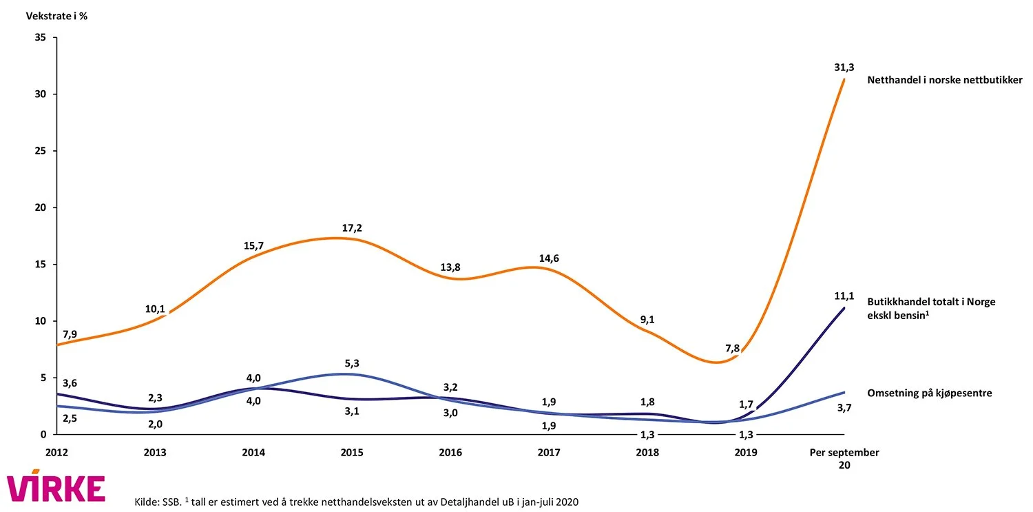 Siden pandemien traff oss i mars har tjenestesalget i Norge stupt, mens varesalget har eksplodert. For dagligvare, byggevare, sport, blomster og alkohol har det vært gode tider, og i denne veksten har netthandelen tatt store steg. Fra å ha en årlig vekstrate i 2019 på 7,8 prosent ligger vekstraten i år på 31,3 prosent, og det er ingenting som tyder på at det kommer til å avta med det første.